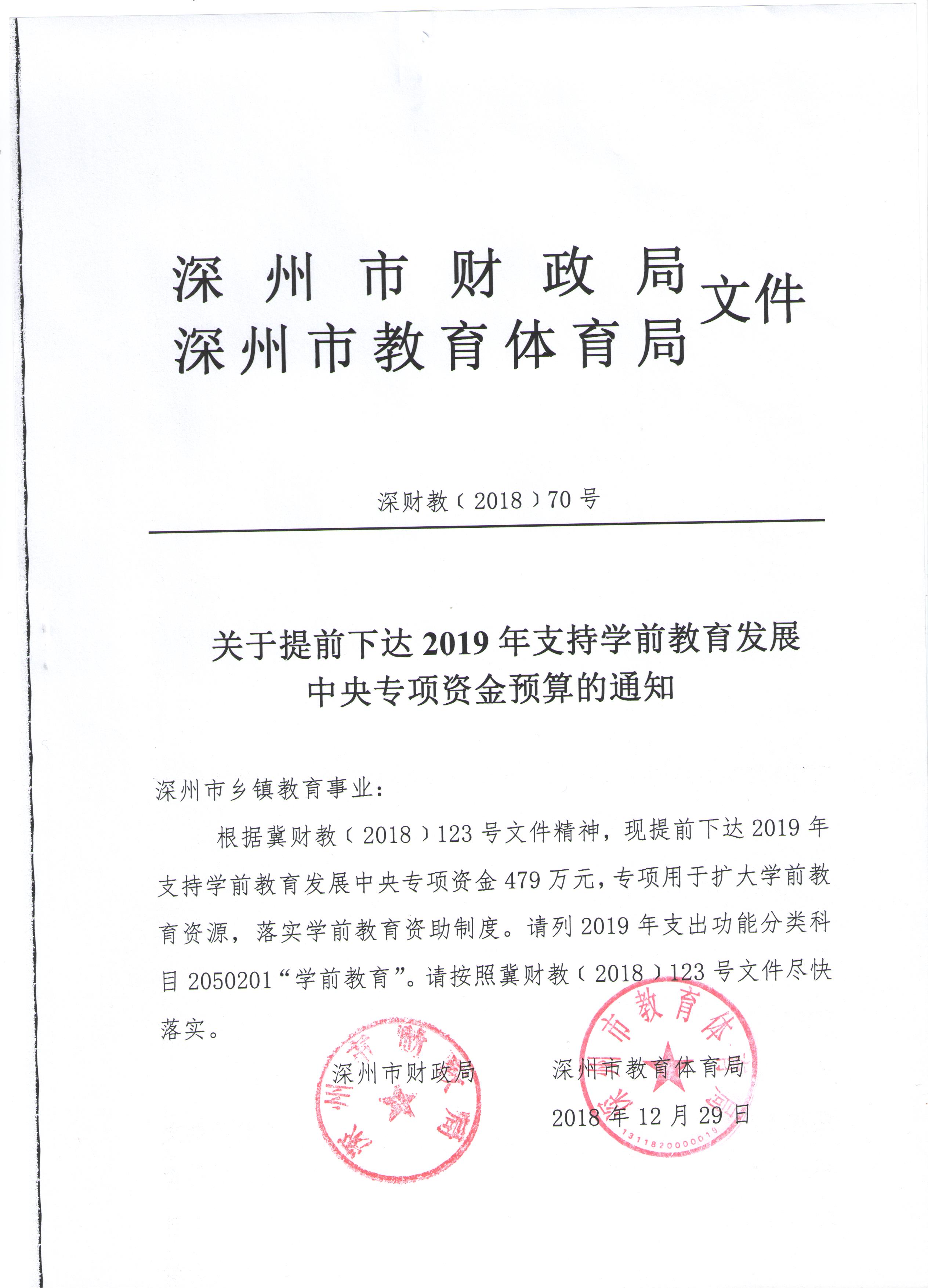 深州市财政局关于提前下达2019年中央财政困难群众救助补助预算指标的通知.doc