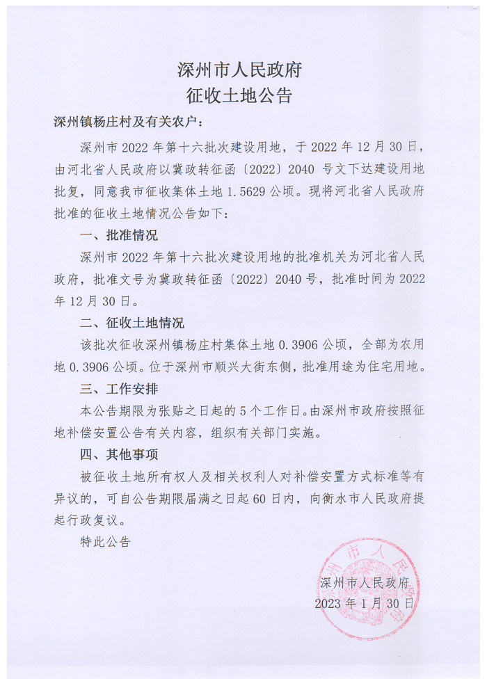 深州市人民政府2022年第七、十六批次建设用地项目征收土地公告
